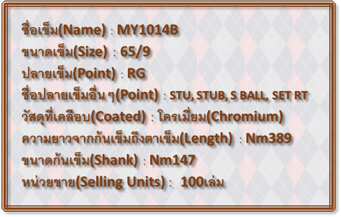 จำหน่าย ปลีก-ส่ง เข็มปัก เข็มเย็บ เข็มพ้ง เข็มลา สำหรับจักรอุตสาหกรรม โทรศัพท์ : 02 307 8407-8 โทรสาร : 02 307 8409 อีเมล์ : kennysunnylnw@gmail.com Retail - Wholesale Embroidery Needle, Sewing Machine Needle for garment industry Tel : +662 307 8407-8 Fax : +662 307 8409 Email : kennysunnylnw@gmail.com